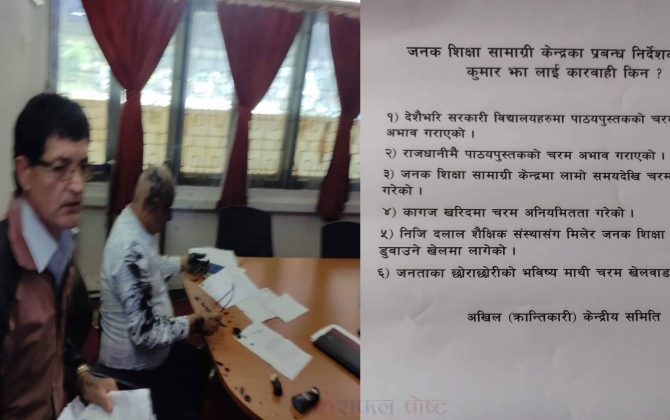 पुरा पढ्नुहोसपरासी।विप्लव नेतृत्वको नेकपा निकट अखिल(क्रान्तिकारी)ले जनक शिक्षा सामाग्री केन्द्रका प्रबन्ध निर्देशक अनिल कुमार झालाई कालोमोसो दलेर जनकारबाही गरेको जनाएको छ।क्रान्तिकारीले प्रबन्ध निर्देशक झा लाइ सरकारी बिधालयहरुमा पाठ्यपुस्तकको चरम किर्तिम अभाव र भ्रष्टाचारको आरोपमा कार्वाही...
