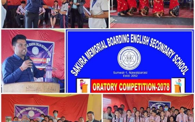 सुनवल,चैत ११।साकुरा मेमोरियल बोर्डिङ्ग ईङ्गिलस सेकेण्डरी बिधालय सुनवल १ मा वक्तृत्वकला प्रतियोगिता सम्पन्न भएको छ। साकुरा बाल क्लबको आयोजनामा बाल क्लबका अध्यक्ष सबिना पङ्गेनीको अध्यक्षता तथा बिधालयका प्राचार्य सुमित पाठकको प्रमुख आतिथ्यतामा तहगत रुपमा कक्षा...