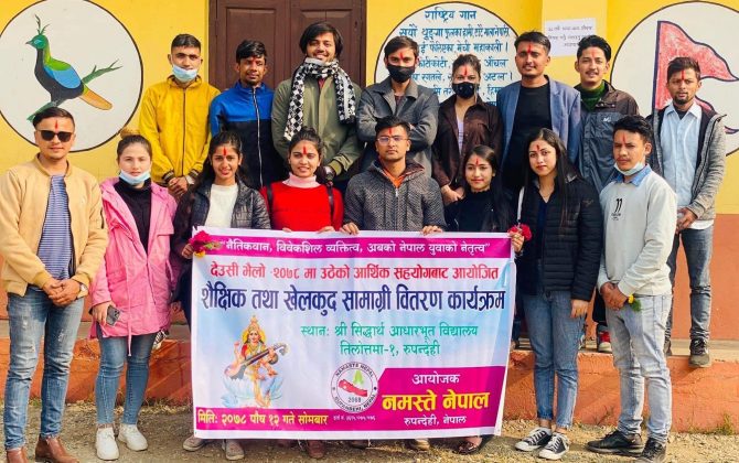 पुरा पढ्नुहोसनमस्ते नेपालले तिलोत्तमा नगरपालिका वडा नंं १ मा रहेको सिद्धार्थ आधारभुत माबिमा शैक्षिक सामाग्री तथा खेलकुलका सामाग्री बितरण गरेको छ ।देउसी भैलो खेलेर जम्मा भएको रकम तथा वडा न १ को सहयोगमा बिद्यालयमा केहि...