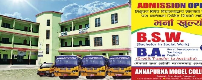पुरा पढ्नुहोसपुस ८ बुटवल । बुटवलमै पहिलो पटक अन्नपूर्ण मोडल कलेजमा यहि शैक्षिक सत्रदेखि वि.एस.डब्लु पढाई हुने भएको छ । त्रिभुवन विश्व विद्यालयद्धारा संचालित ४ बर्षे बि.एस.डब्लु कार्यक्रम अन्नपूर्ण मोडल कलेज वुटवलमा यसै शैक्षिक सत्र...