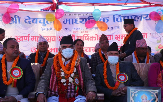 पुरा पढ्नुहोसपुष ८ नवलपुर। गण्डकी प्रदेशका मुख्यमन्त्री कृष्णचन्द्र नेपाली पोखरेलले प्रदेश सरकारले व्यवहारिक शिक्षामा लगानी गर्ने बताउनुभएको छ । आज नवलपरासी (बर्दघाट–सुस्तापूर्व)को देवचुली नगरपालिकास्थित रहजरमा रहेको देवचुली माध्यमिक विद्यालयको स्वर्णमहोत्सव उद्घाट गर्दै मुख्यमन्त्री पोखरेलले प्रदेशमा...