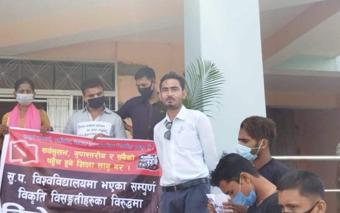 पुरा पढ्नुहोसहेमन्त वली ,साउन १९,दाङ।त्रिभुवन विश्वविद्यालय र अन्य विश्वविद्यालयहरुमा शैक्षिक विकृति अत्याधिक मैलाएको भन्दै अखिल (क्रान्तिकारी) दाङले लमहीमा प्रदर्शन गरेको छ।प्रदर्शन कार्यक्रमलाइ सम्बोधन गर्दै अखिल(क्रान्तिकारी)राप्ती व्युरो सदस्य अनिलले नेपालका बिश्वबिद्धालयहरु दलालहरुको हातमा पुगेको बताए। उनले बिश्वबिद्धालयहरुले...