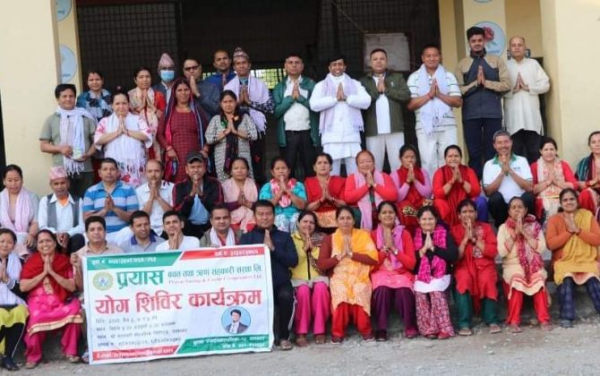 बुटवल ६ चैत ।प्रयास बचत तथा ऋण सहकारी संस्था लिमिटेडले निशुल्क योग शिविर सम्पन्न गरेको छ।“योग गरौ निरोगी बनौ ”भन्ने मूल मन्त्रका साथ कार्यक्रम गरिएको आयोजकले बताएको छ । कार्यक्रममा बोल्दै कार्यक्रमका प्रमुख अथितिको रुपमा...