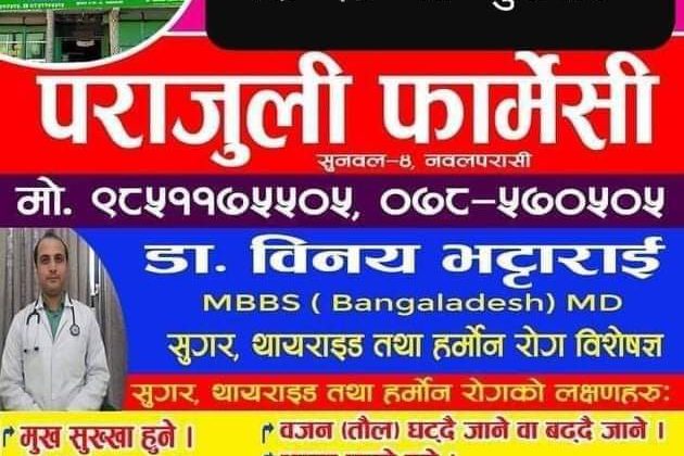 पुरा पढ्नुहोसभदौ ४ सुनवल पश्चिम् नवलपरासीको सुनवलमा रहेको पराजुली फार्मेसीमा काठमाडौ बाट सुगर तथा थायराईड रोग विशेषज्ञ इन्डोक्राईनोलोजिस्ट डाक्टर भदौ १८गते शुक्रबार आउदै हुनुहुन्छ काठमाडौका ह्याम्स र मेट्रो अस्पतालमा कार्यरत डाक्टर बिनय भट्टराई भदौ १८ गते शुक्रबार...