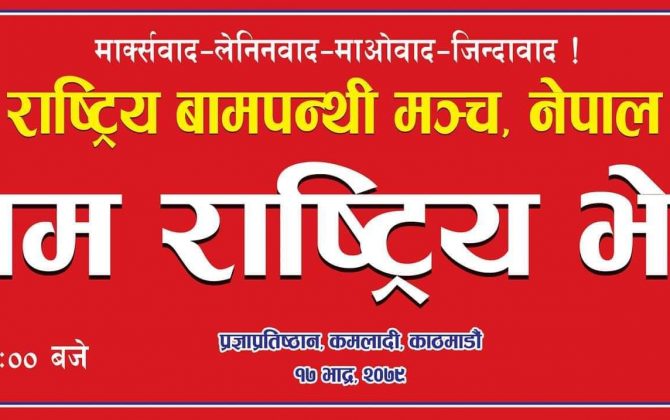 पुरा पढ्नुहोसकाठमाडौं।राष्ट्रिय वामपन्थी मञ्च नेपालको केन्द्रीय भेला भोलि भाद्र १७ गते मन्ध्यांह १२:०० बजे काठमाडौंको प्रज्ञाभवनमा हुने भएको छ। मञ्चका संयोजक दीर्घप्रसाद पाण्डेको अध्यक्षतामा बिहिबार बसेको बैठकले भाद्र १७ गते भेला गर्ने निर्णय गरेको थियो। नेपालका विभिन्न...